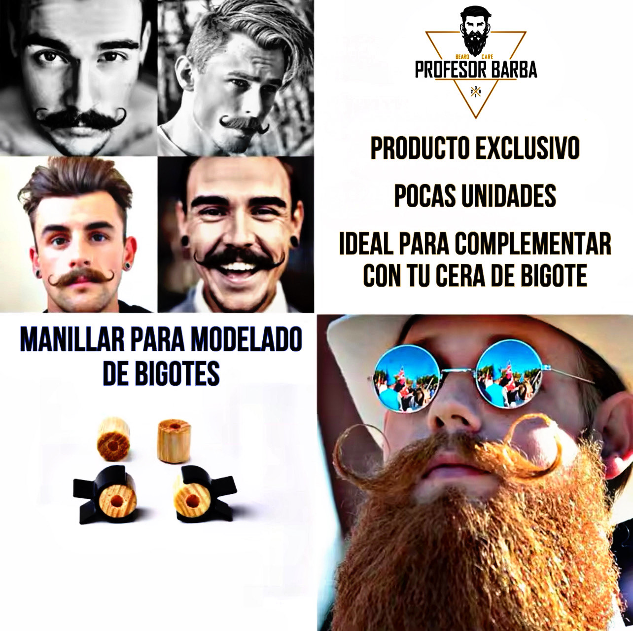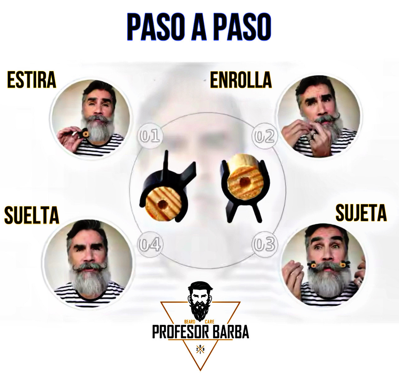 Modo de Uso: use los rodillos de madera y/o silicona para sujetar y girar el bigote, luego asegúrelo con los clips.